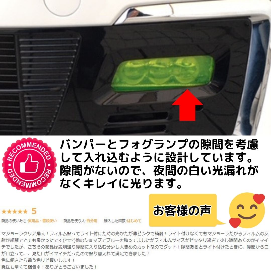| 注意 | ・専用カットですが、気温による伸び縮みやパネル個体差によるズレが生じる場合があります。 ・粘着力が低下する恐れがありますので、取付前には必ず施工面のクリーニング、脱脂を行ってください。 ・光の加減やモニターの設定等で写真と実際の商品の色味が異なる場合があります。また、ロットにより色の濃さが変わる場合があります。 ・フォグランプに貼るフィルムです。フォグランプの販売ではありません。 ・パーツの個別売りおよびパーツごとに色を変更することはできません。 ・保護フィルム付きの商品はカットの都合上、剥がした状態での発送となります。 ・今後のMCやグレード等により仕様が違う場合がありますので画像と比較し、種類や形状、大きさをご確認ください。注文後のカラーの変更は対応しかねます。 ・こちらはメール便対応商品のため、代引き不可となります。 |